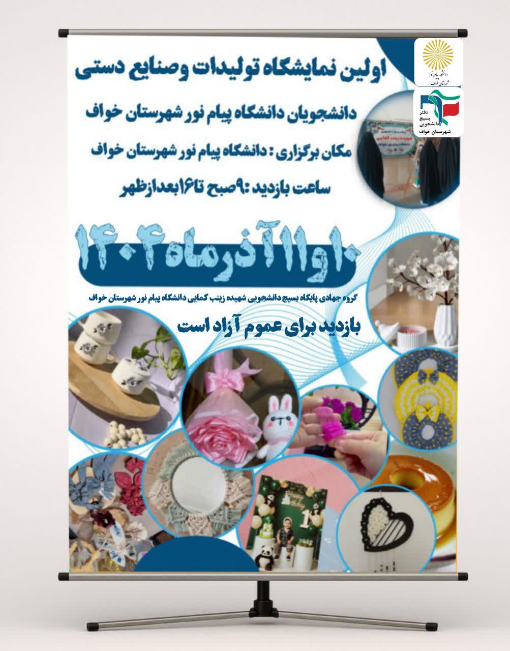 اولین نمایشگاه تولیدات و صنایع دستی دانشجویان دانشگاه پیام نور شهرستان خوافدر روزهای ۱۰و۱۱ آذرماه ۱۴۰۴ در دانشگاه پیام نور خواف برگزار می گردد. لازم به ذکر است بازدید برای عموم آزاد است